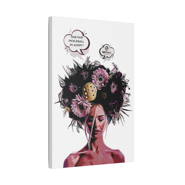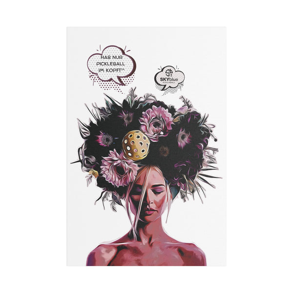 Bring bold energy and pickleball passion to your home, studio, or office with the "Hab nur Pickleball im Kopf™" textile wall art. This vibrant piece showcases a striking composition: a serene woman with closed eyes, her hair transformed into a blooming bouquet of roses, peonies, and thistles—all crowned by a radiant golden pickleball. Speech bubbles float above with the SKYblue Pickleball and "Hab nur Pickleball im Kopf™" logos, anchoring the piece in playful, modern surrealism.